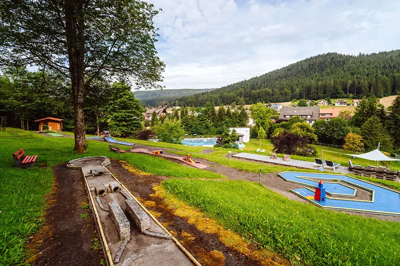 Die Minigolfanlage im Ortsteil Obertal bei Baiersbronn liegt idyllisch am Hang oberhalb der Liegewiese des Freibads und lädt mit 11 farbenfroh gestalteten Bahnen zu einer lebendigen Runde ein.